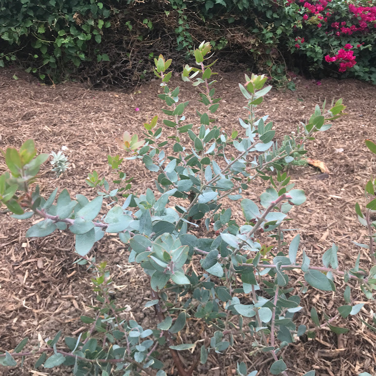 Evergreen shrub to 8 ft. Blue-grey leaves, reddish brown bark, with dark pink flowers in early spring. Hybrid of A. pajaroensis, selected for the garden by Lester Rowntree in the 1940's. Attracts hummingbirds, excellent wildlife plant. Beautiful specimen. Full sun, low-water. Fast-draining soils. Hardy to 15º F